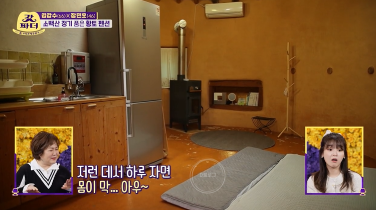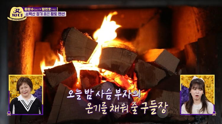 장민호, 김갑수가 소백산 자락에 위치한 황토 숙소를 방문했어요. 자연과 어우러진 숙소가 보기만 해도 힐링되네요. 황토랑 나무로 지어진 집이어서 부모님들이 특히 좋아하시겠어요. 장작이 왜 이렇게 많나 싶었는데 장작을 패서 아궁이에 직접 불을 땐데요.
