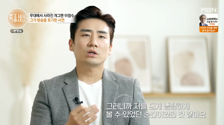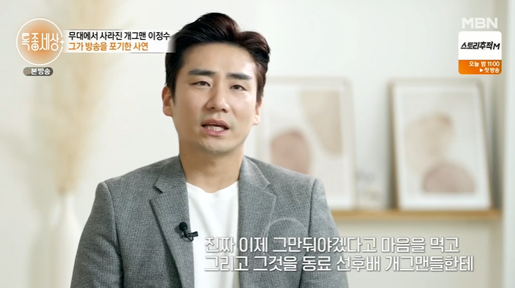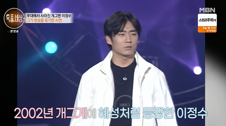 이정수는 2002년 개그계에 혜성처럼 등장, 폭발적인 인기를 끌었어요. 하지만 방송에서 사라진 이유는 뭘까요? "일이 딱 끊어지더라고요. 사실 그때 조금 많이 울었죠. 여러 가지로 많이 힘들었던 거 같아요. 제일 힘들었던 건 진짜 이제 그만둬야겠다고 마음을 먹고 동료 선후배 개그맨들한테 얘기했을 때 돌아오는 반응. 사실 그 당시에는 일종의 도망이었거든요"