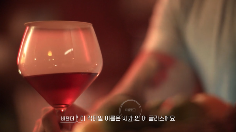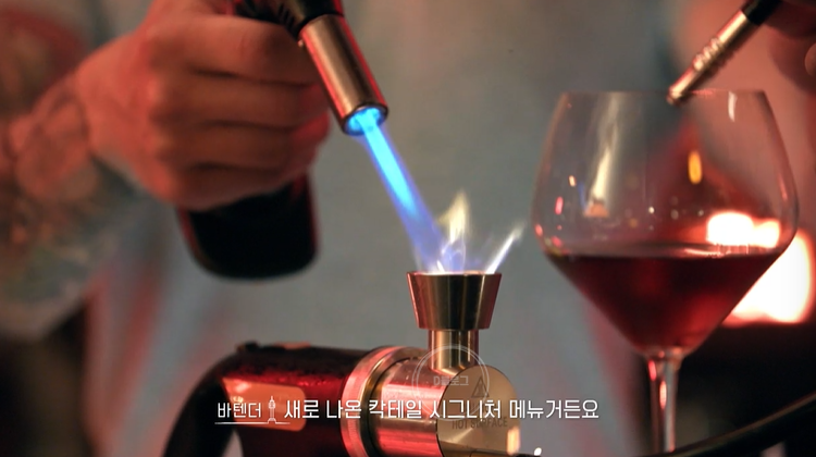 알감자 메뉴도 이색적이에요. 이효리는 칵테일 원샷하고 두 번째로 시그니처 메뉴인 '시가 인 어 글라스'를 주문했어요. 이 바에만 있는 메뉴로 스모크를 잔에 머금은 게 특이하네요. 도수는 30도 정도로, 다크럼이랑 아일랜드 위스키를 합쳤대요. 이효리 완전 만족 ㅋㅋㅋ