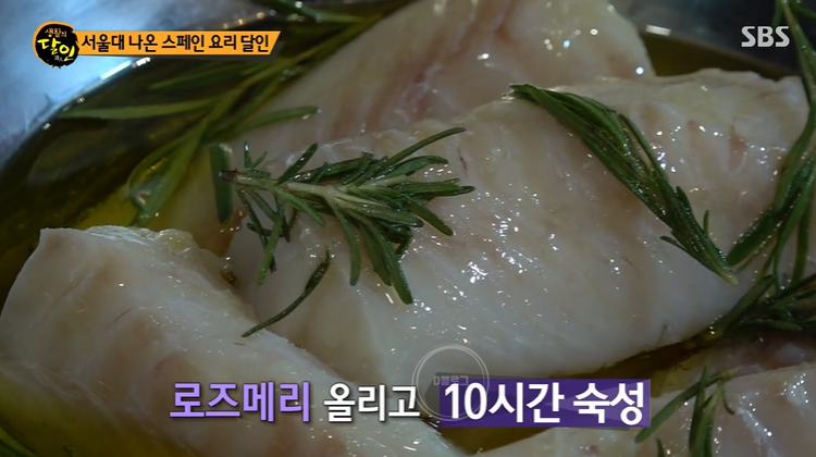 오렌지, 사과, 꿀을 넣고 푹 끓여낸 물에 대구살을 넣고 하루 숙성시켜요. 그러면 생선이 단단한 상태를 유지한 채 숙성된대요. 이후 엑스트라 버진 올리브유와 로즈메리를 넣고 10시간 또 숙성하기. 이 모든 과정을 거쳐야 달인의 요리가 완성된대요.