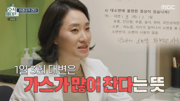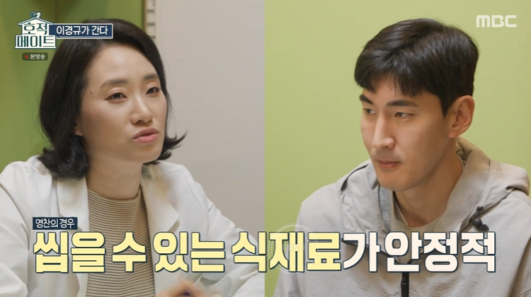김영찬은 1일 3번 화장실을 간다고 해요. 이에 김수경 한의사는 가스가 많이 찬다는 뜻이라며, 프로틴 대신 닭고기나 소고기를 먹으라고 조언하네요. 항상 고기와 채소를 함께 먹는 게 도움이 된다고! 고기만 먹으면 노폐물이 쌓일 수 있대요.