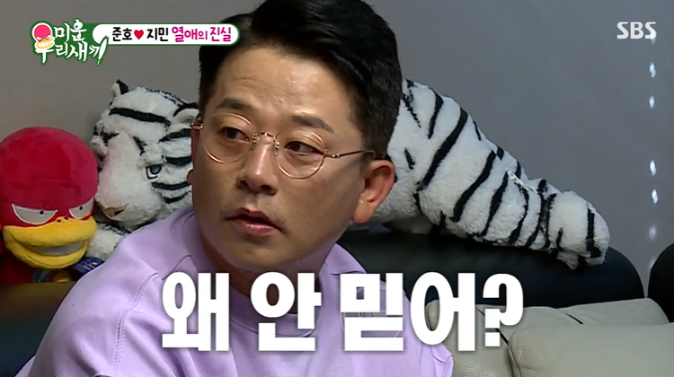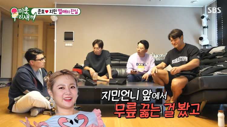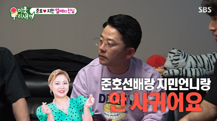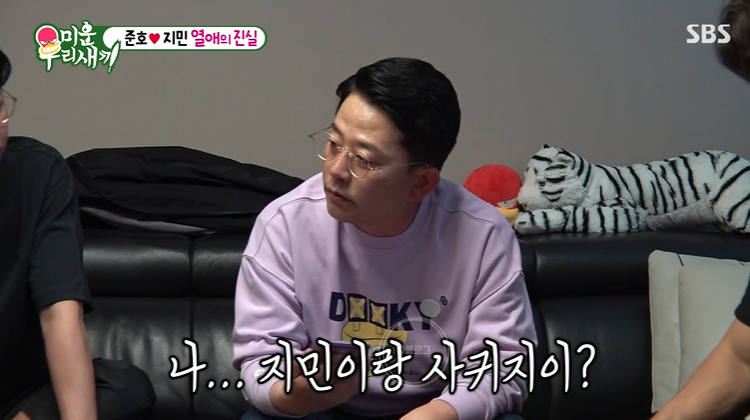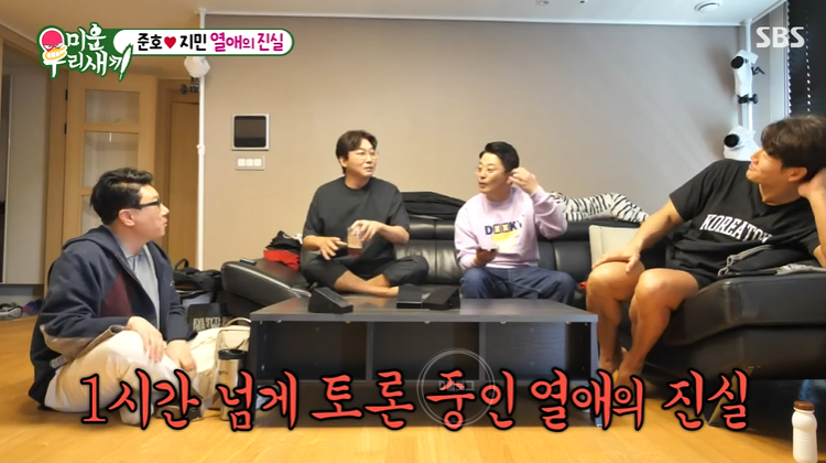 이상민은 김지민이 진짜 김준호를 좋아하는 게 맞냐고 물었어요. 김준호는 "예전에는 선배로서 좋아했는데 지금은 남자로서 좋아하지" 근데도 세 사람은 여전히 믿지 못했어요.