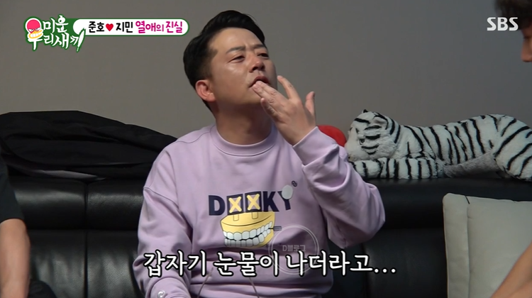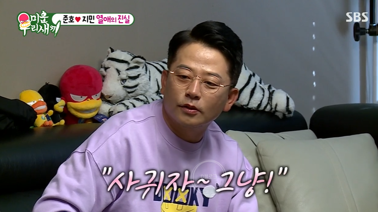 그러자 탁재훈은 전에 김준호 집에서 발견된 향초 선물에 대해 물었고 김준호는 그때는 사귈 때가 아니었다고 손을 저었어요. "그때는 내가 좋아한 정도였고 최근에 정식으로 사귀자 해가지고. 썸도 아니고 내가 일방적으로 좋아했지. 최근 한 1~2년 동안"