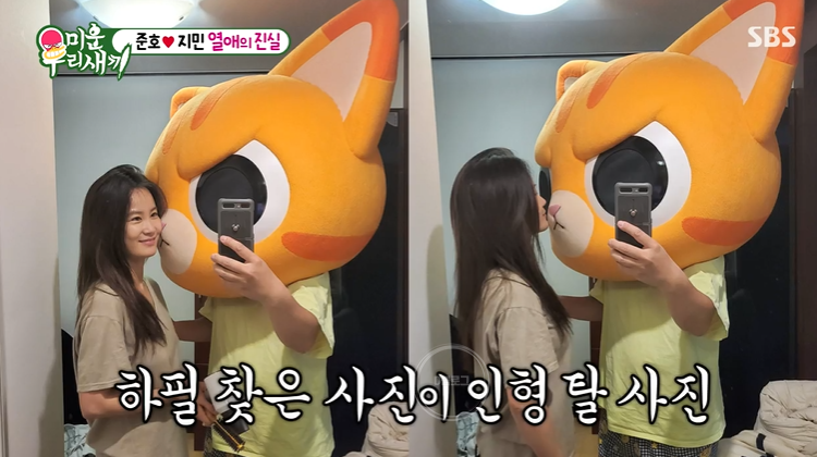 김종국은 커플 사진을 요구했어요. 한참을 찾던 김준호는 마쭈 탈을 쓰고 김지민과 찍은 사진을 보여줬어요ㅋㅋㅋ 그러자 마쭈가 김준호 맞냐며 또 불신ㅋㅋㅋ 근데 뽀뽀 사진도 찍었네요! 두 분 보기 좋아요!