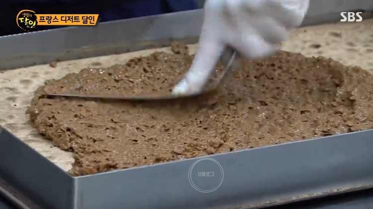 이렇게 완성된 반죽은 판에 올려 얇게 펴줘요. 그리고 오븐에 넣어 굽기! 구운 반죽은 모양을 잡아 식혀줘요. 눈으로만 봐도 얇고 바삭한 식감이 느껴지는 거 같네요. 손으로 잘게 부숴 초콜릿, 버터, 헤이즐넛에 넣고 페이스트를 만들어요. 그리고 달걀흰자 시트에 페이스트 잘 발라 주기!