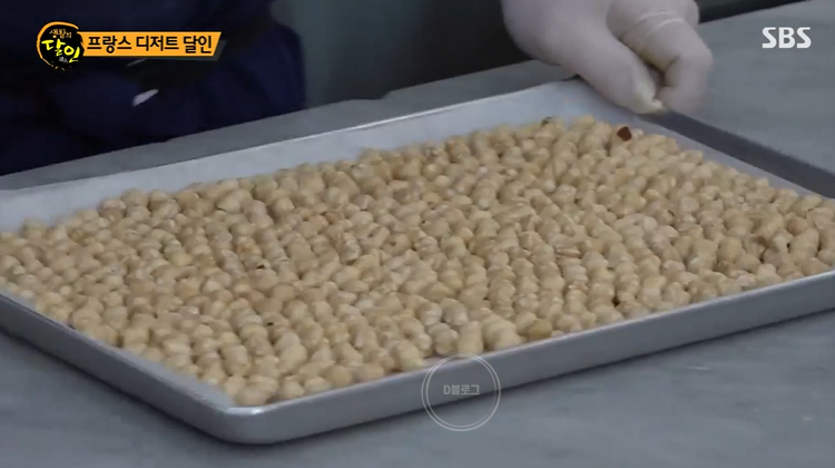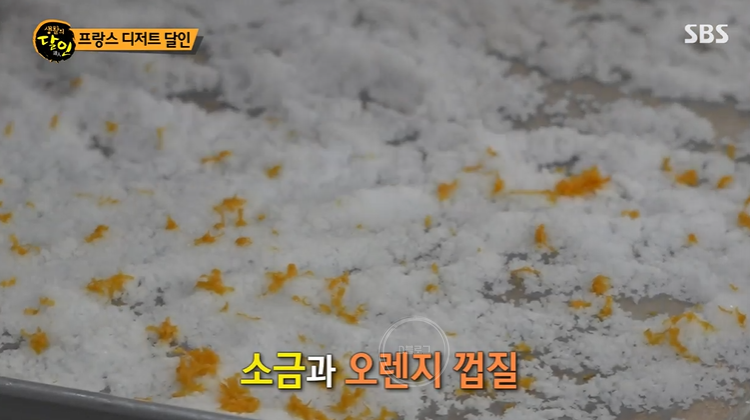 케이크 식감을 살리기 위해 헤이즐넛도 추가해요. 소금과 오렌지 껍질을 바닥에 깔아주고 헤이즐넛을 올려 구워준대요. 이 방법으로 헤이즐넛을 구우면 헤이즐넛 풍미와 오렌지 향이 어우러져 훨씬 더 맛있어진대요. 케이크를 만드는 과정 하나하나 모두 달인의 정성이 담겨 있네요.