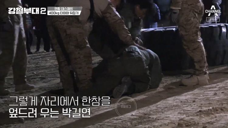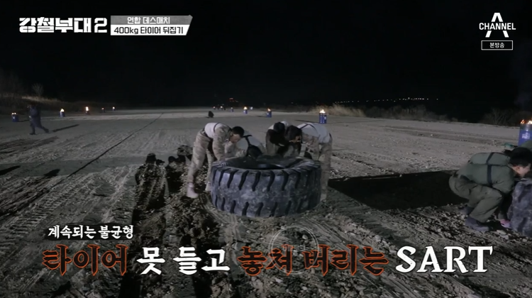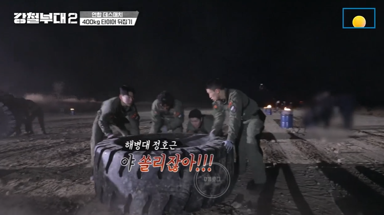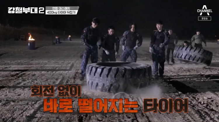 미션은 바로 400kg 타이어 뒤집기! 네 부대 모두 처음 접하는 400kg 타이어에 말을 잃었어요.
