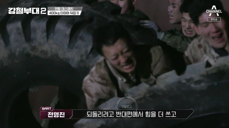 그런데.. 타이어 뒤집기는 힘도 중요하지만 합이 중요하다는 걸 정보사가 깨닫게 해줬어요. 초반 뒤처지던 정보사는 정확한 구령으로 한번에 뒤집어 타이어가 흔들림없이 제대로 뒤집어졌어요. 하지만 다른 부대는 힘의 불균형이 생기기 시작했고, 타이어가 어느 한쪽으로 쏠리기 시작했죠. 당연히 방향을 다시 잡기 위해 더 많은 힘이 필요하게 됐어요.