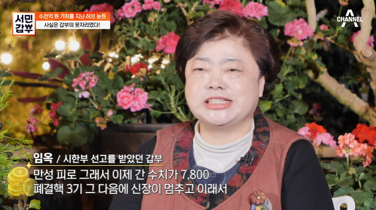 이런 어마어마한 허브 농원을 지은 사람은 바로 61세 갑부 임옥 님. 지금도 매일 현역에서 일을 하고 있대요. 갑부는 포천에 오기 전 커피 가맹점, 문화센터 강의, 레저 산업 등을 진행했지만 36살에 과로로 쓰러지게 됐대요. 그리고 젊은 나이에 치료 불가, 시한부 선고를 받았다고 하네요.