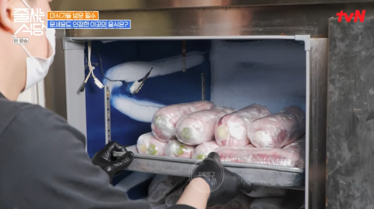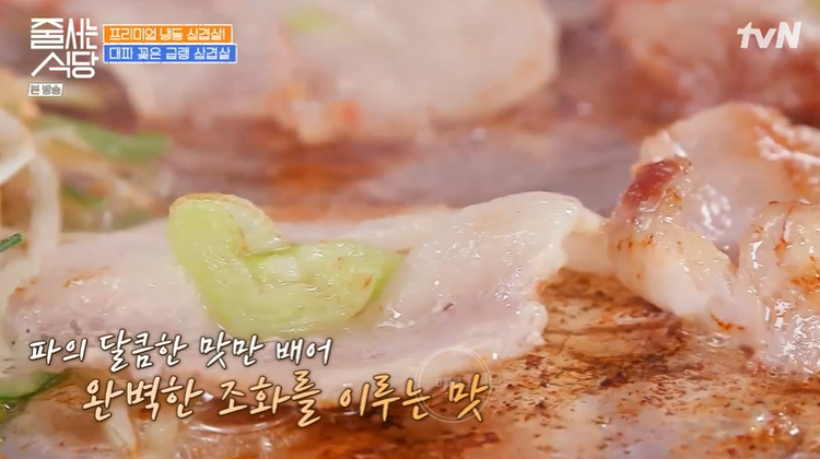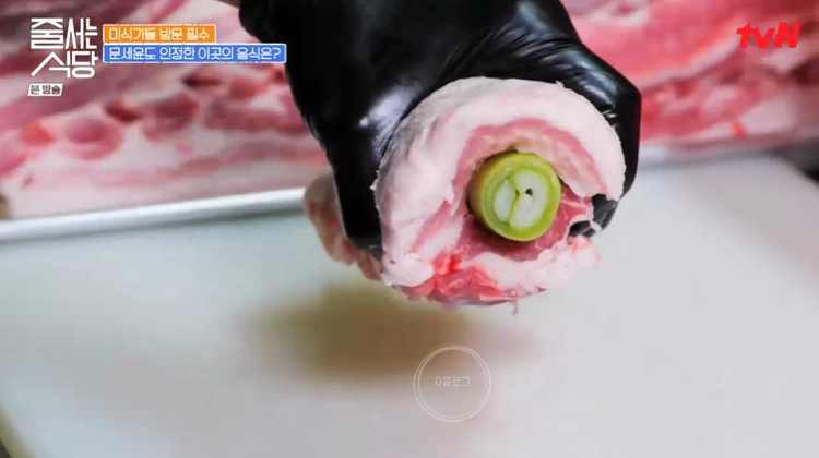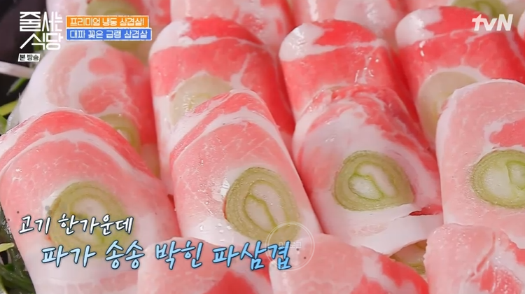 그런데 특이한 게 이 식당 삽겹살 가운데에 파가 박혀 있어요! 이건 정말 처음 보는 비주얼이네요. 햇님이 문세윤 추천으로 온 식당이래요. 생삽겹살에 칼집을 내 대파를 꽂아 넣네요. 그리고 영하 30도 냉동고에서 24시간 급랭해 모양을 잡아준대요. 그리고 얼린 고기를 기계로 썰어 파 기름을 발라주면 완성.