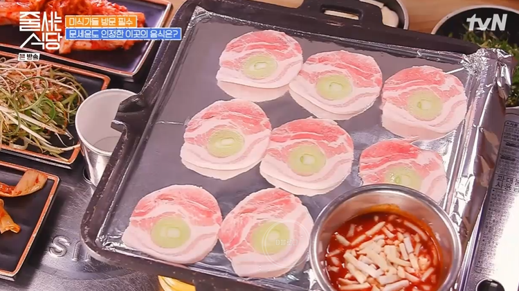 불판 위에 냉삽겹, 김치, 파김치 올리는 건 국롤! 와 진짜 너무 맛있겠어요!