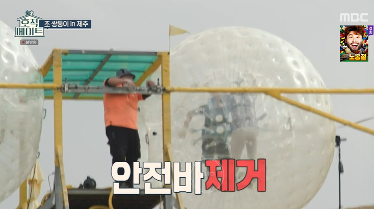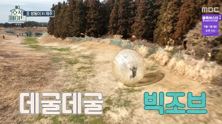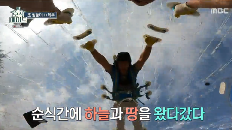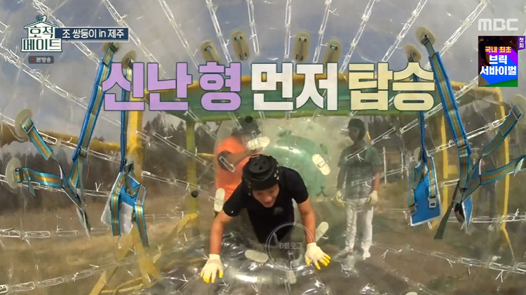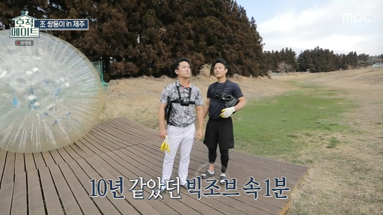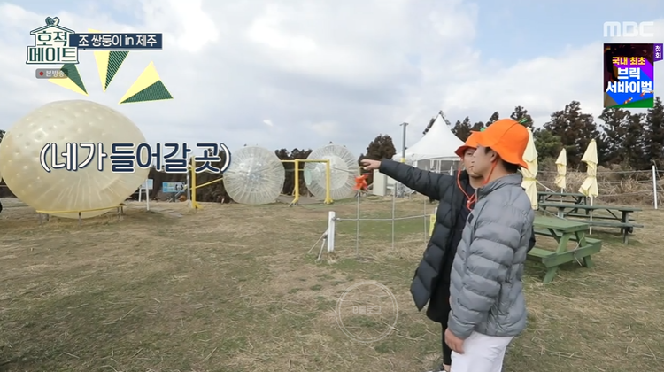 '호적메이트' 조 쌍둥이 제주 여행기! 오늘 방송에는 빅조브를 즐기러 떠났어요. 큰 콩 안에 들어가 데굴데굴 구르는 놀이체험인데요. 소지품을 모두 빼고 헤어기어랑 장갑 등 안정 장비를 착용해요.