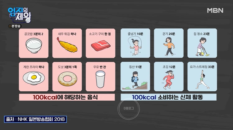 100칼로리에 해당하는 음식은 공깃밥 2/3, 새우 튀김 하나, 소고기 구이 한 점, 계란 프라이 하나, 도넛 1/3쪽, 우유 반 잔 등이 해당돼요. 반면 100칼로리를 소비하는 신체 운동은 줄넘기 10분, 걷기 20분, 집 청소 23분, 등산 11분, 조깅 12분, 요가 스트레칭 33분이죠. 100칼로리를 덜 먹거나, 100칼로리만큼 신체 활동을 더 하자는 거예요.