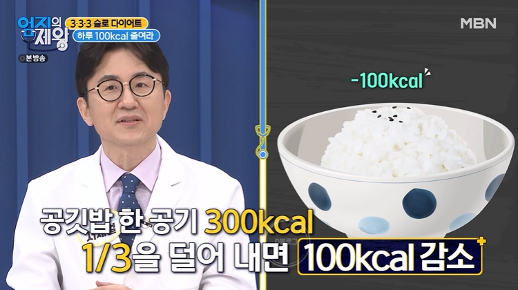 공깃밥 한 공기가 300칼로리인데, 1/3을 덜어내면 100칼로리를 덜 먹는 거예요.