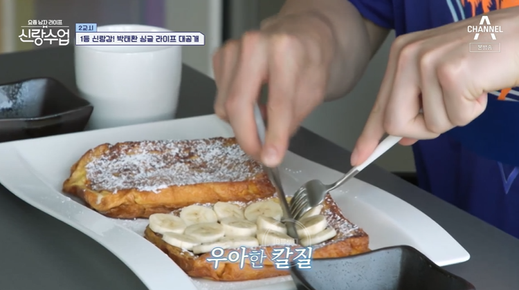 냉장고도 칼각 진열 실화인가요. 살림도 너무 잘해요. 혼자 있어도 바나나 프렌치토스트 제대로 플레이팅 해 먹네요.