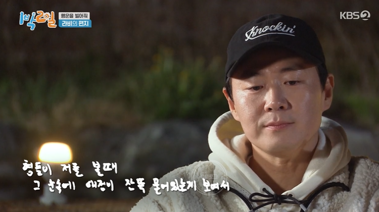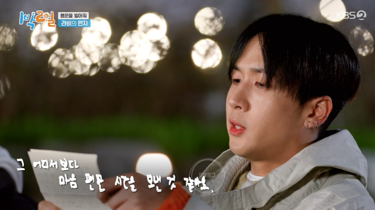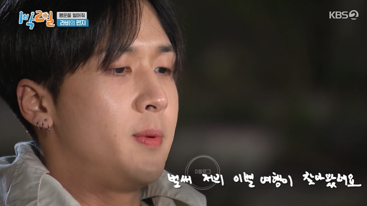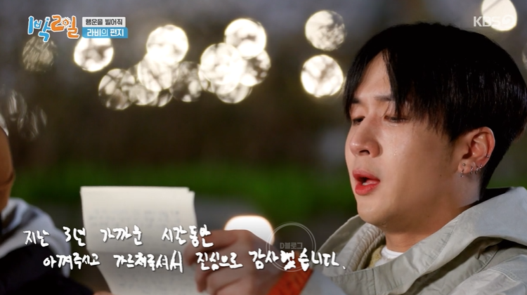 '쌓인 정만큼이나 하고 싶은 말이 너무 너무 많은데 미리 적어 놓지 않으면 제 마음을 제대로 전달하지 못할 것 같아서 이렇게 편지를 써요. 정훈이형, 종민이형, 세윤이형, 철이형, 인우, 그리고 방대장님과 1박2일 스태프 가족 여러분! 그리고 시청자 여러분 라비입니다'