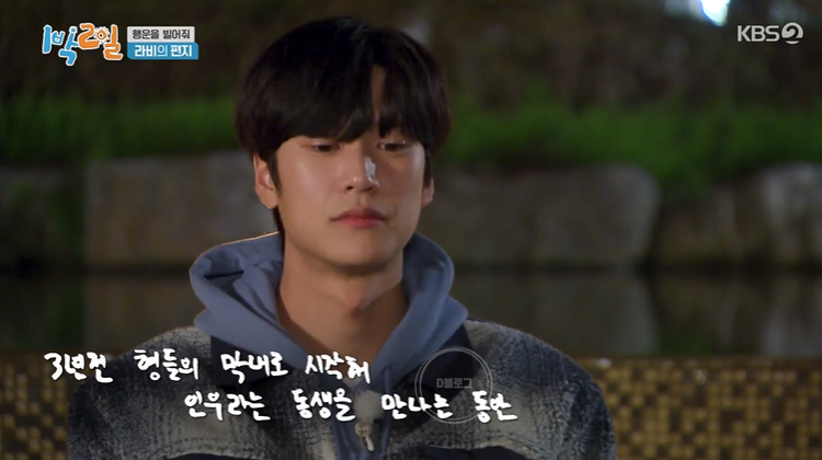 '여러분과 함께라서 밖에서 자도 좋았고요. 여러분과 함께라서 밥을 못 먹어도 좋았고요. 여러분과 함께라서 여기까지 올 수 있었던 것 같아요. 그리고 저는 일박이일 모니터 하는 걸 진짜 좋아하거든요? 그 이유 중에 가장 큰 이유는 형들이 저를 볼 때 그 눈 속에 애정이 잔뜩 묻어있는 게 보여서 그 눈들을 발견하는 게 저를 되게 행복하게 해 줬어요'