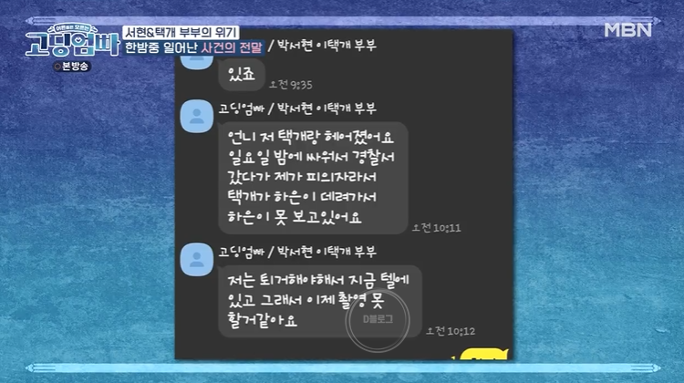 그리고 며칠 후 4월 3일 박서현은 제작진에게 충격적인 문자를 보내요. '저 택개랑 헤어졌어요. 일요일 밤에 싸워서 경찰서 갔다가 제가 피의자라서 택개가 하은이 데려가서 하은이 못 보고 있어요. 저는 퇴거해야 해서 지금 텔에 있고 그래서 이제 촬영 못할 거 같아요'