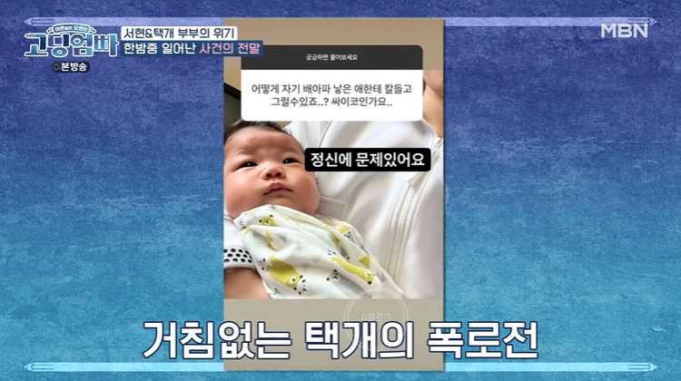 이택개는 서현에게 아기 사진을 보내도 한마디 없고, 양육수당도 모두 서현이 통장으로 들어간다며 자신이 현재 아기를 돌보느라 일을 못해 돈이 필요한 상황이라고 인터뷰도 했어요. 현재 임시 거취 하는 곳은 아버지 집으로, 이택개는 홀로 육아 중이네요. 다행히 아기는 건강한 상태 ㅜㅜ