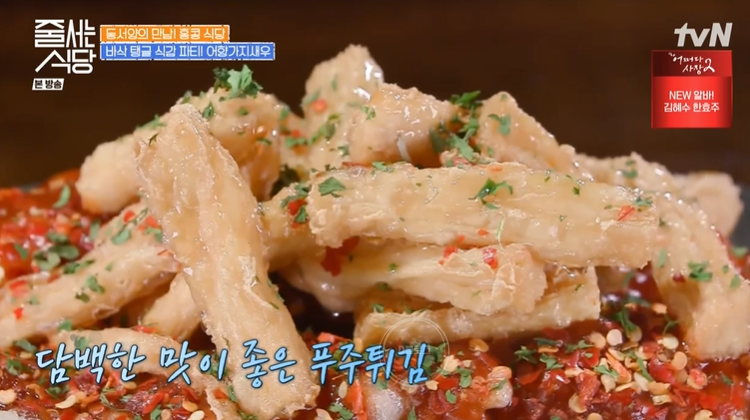 다음 등장한 메뉴는 어향가지새우와 만두피튀김! 칼집 낸 통가지에 튀김옷을 두 번 입혀 기름에 튀겨요. 그리고 어향 소스 위에 튀긴 새우, 통가지 튀김을 올린 뒤 소스를 뿌려요. 마지막으로 생소한 푸주튀김을 올리면 완성.