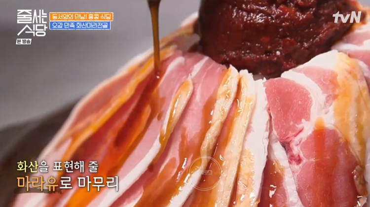 첫 번째 메뉴로 화산마라전골이 등장했어요. 손질한 각종 야채와 중국 당면 등을 냄비에 산더미처럼 쌓고 그 옆을 우삼겹으로 둘러싸요. 그리고 특제 마라장을 맨 위에 올리고 마라유까지 뿌려주면 화산 마라전골 완성. 박나래는 가격에 비해 가성비가 좋다며 칭찬하네요.