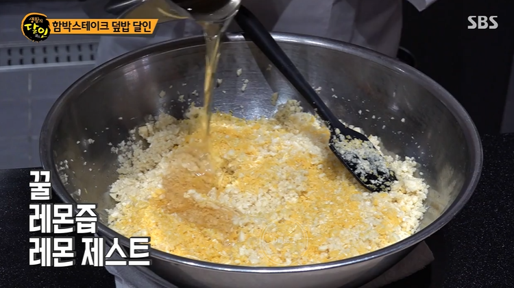이후 레몬 제스트, 레몬즙, 꿀까지 넣어주면 완성이에요. 함박스테이크와 마늘소스의 조합이 정말 궁금해지네요!