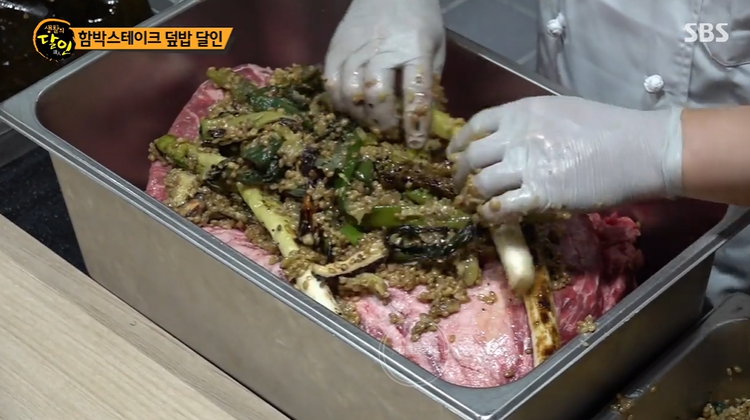 이제 소고기를 올려요. 그리고 다시 밥을 덮어요. 정말 지극정성이네요! 직접 개발한 방법으로, 이 상태로 3일간 재워준대요. 숙성된 고기는 빛깔부터 다르네요.