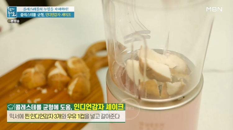 1. 믹서에 찐 인디언감자 3개와 우유 1컵을 넣고 갈기