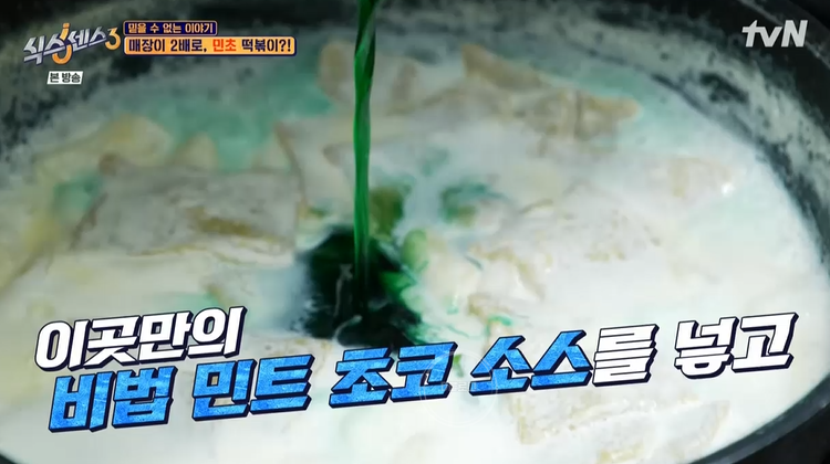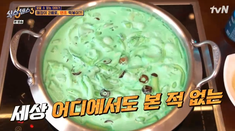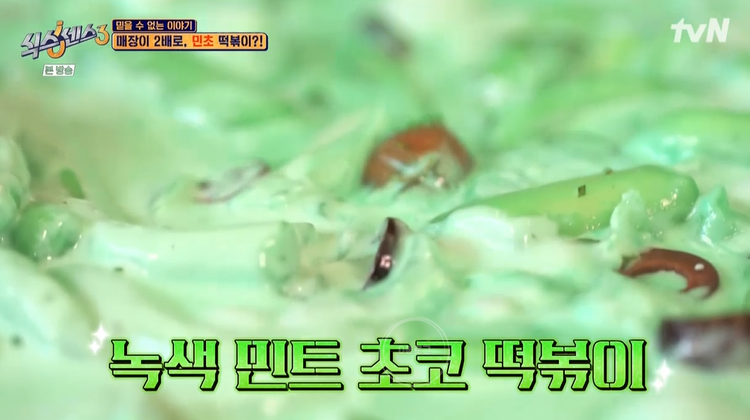 이곳 사장님은 국내 최초 녹색 민트 초코 떡볶이를 탄생시켰대요. 일반적인 크림 떡볶이 재료들로 베이스로 만들지만, 비법 민트 초코 소스를 넣는 것부터 달라지네요. 색상이 처음 보는 색이라 벌써부터 호불호가 완벽히 갈릴 것 같은 느낌적인 느낌..