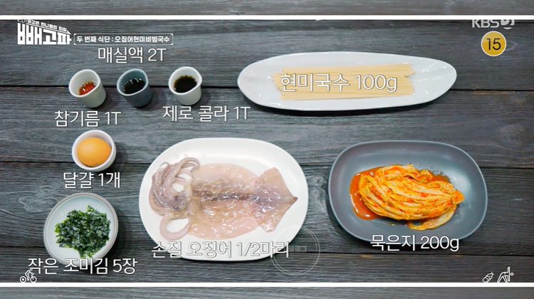 ♥ 재료(1인분 기준) : 현미 국수 100g, 묵은지 200g, 손질 오징어 1/2마리, 작은 조미김 5장, 달걀 1개, 참기름 1T, 제로콜라 1T