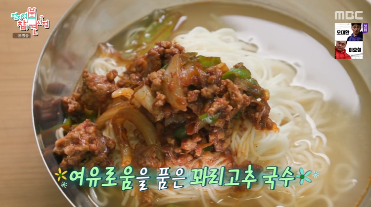 7. 국수에 육수 붓고 꽈리고추양념 올리기