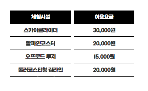 엎드린 상태로 바닥 보면서 서서히 출발해요. 위에서 보니까 독수리가 나는 것 같아요! 그러다 점점 가속도가 붙는데 정말 나는 거 같겠어요. 멤버들 재밌었는데 앙코르, 한번 더 탔네요. 가격이 궁금해서 찾아보니까 3만 원이에요! 여기 입장료도 따로 있어요. 성인 성수기 6천 원, 주차요금은 소형차 2천 원.