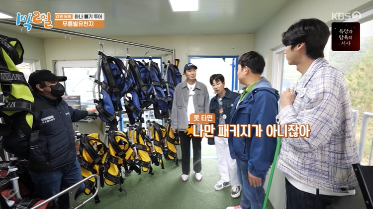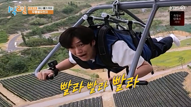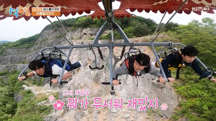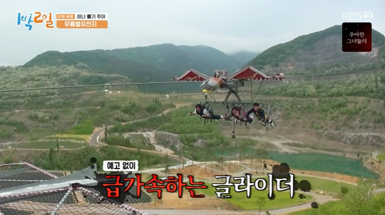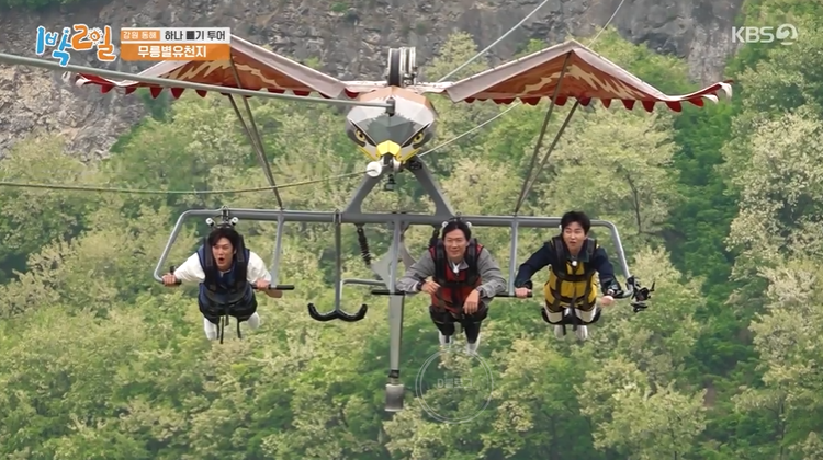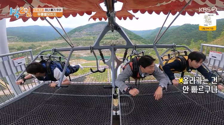 스카이글라이더에도 도전했네요. 총길이는 777m래요. 125m 높이의 상공에서 최고 시속 80km로 활강한대요. 몸무게는 100kg 제한이라서 문세윤 제외! 근데 좋아하는 문세윤ㅋㅋㅋ