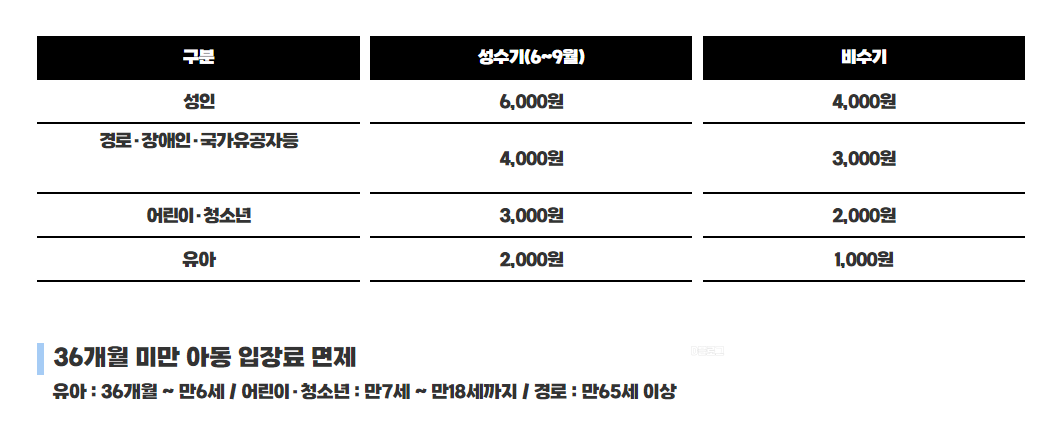 가격 : 입장료 성인 6천 원, 주차요금 소형 2천 원 등