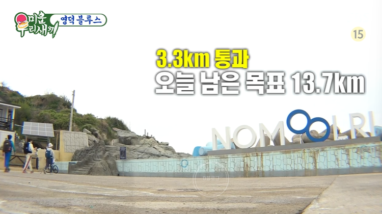 구간별로 풍경이 계속 바뀌어서 지루할틈도 없겠어요. 산 내려오면 그림 같은 바다 마을도 있네요! 해녀 분도 계세요! 제주도 온 것 같아요. 마을 이름은 노물리, 늙지 말라는 뜻이네요.