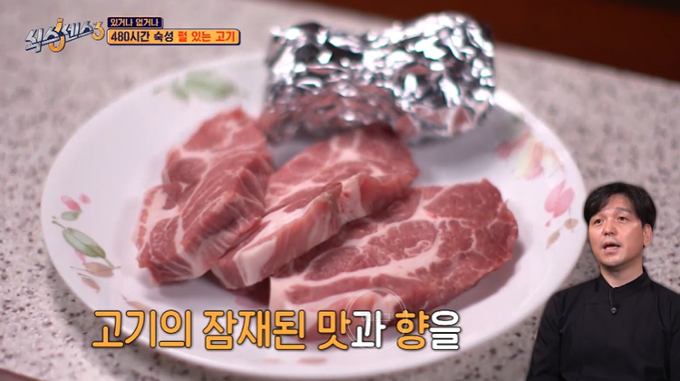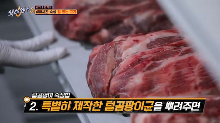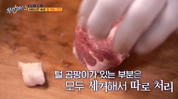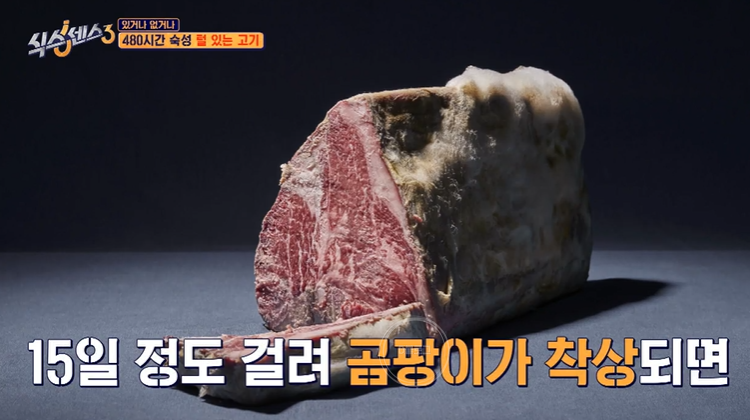 고기 비주얼이 좀 충격적이에요. 털 곰팡이 발효 숙성 고기를 판매한다는 사장님. 시골집 된장에서 발견되는 유익 곰팡이 효과에서 착안했대요. 곰팡이가 된장 맛을 더 좋게 하죠. 고기 또한 잠재된 맛과 향을 최대한 끌어올려 준대요. 20일, 480시간 동안 숙성시킨다고.
