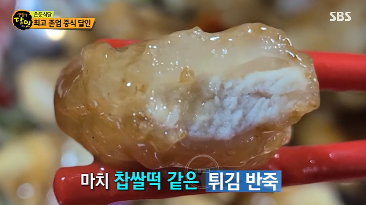옛날 탕수육도 아니고 찹쌀 탕수육도 아닌, 겉은 옛날 탕수육처럼 바삭한데 한입 베어 물면 전분 가루가 찹쌀떡처럼 쫄깃하대요. 마치 찹쌀떡을 먹었을 때처럼 쫄깃하다고! 바삭함과 쫄깃함의 조화! 너무 먹어보고 싶네요!
