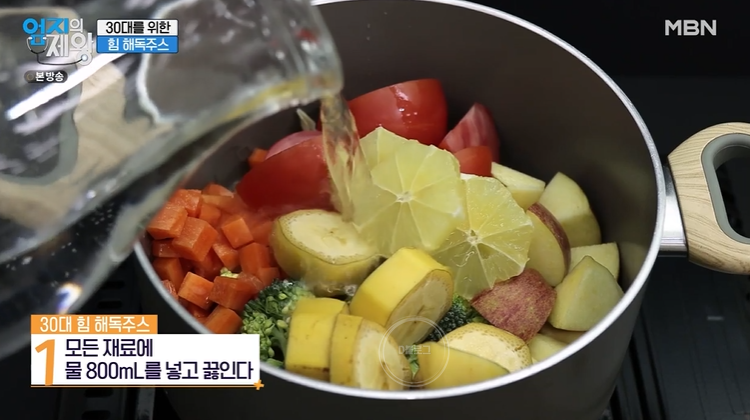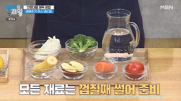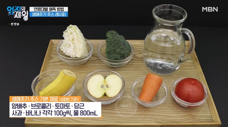 양배추, 브로콜리, 토마토, 당근, 사과, 바나나 각각 100g씩, 물 800mL