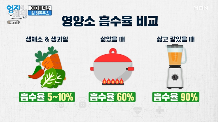 생채소 생과일은 흡수율 5~10%, 삶았을 때는 흡수율 60%, 삶고 갈았을 때는 흡수율 90%.
