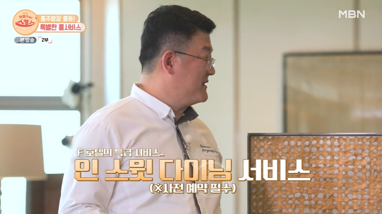 룸서비스도 공개됐어요. 사전 예약하면 인 스윗 다이닝 서비스로, 셰프님이 직접 음식을 가져다 주세요. 인 스윗 다이닝이란 멋진 스위트룸에서 고품격 룸서비스를 받는 걸 말해요.