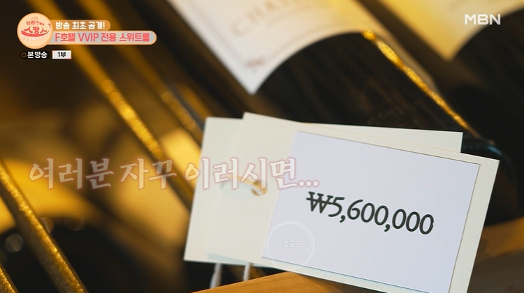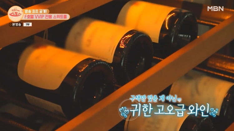 이곳은 방음 시설 완벽한 미니 영화관, 미디어 룸이에요. 주방에는 와인도 준비됐어요. 가격이 560만원인 술도 있네요.