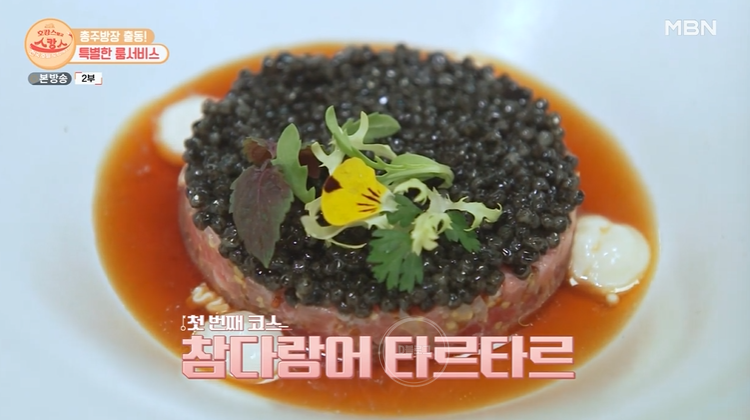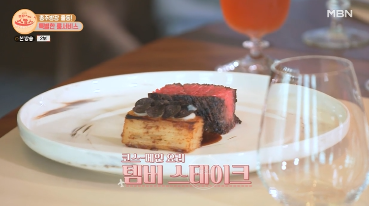 첫번째 코스는 참다랑어 타르타르! 세계 3대 진미인 캐비어를 올렸네요. 바텐더가 함께 와서 칵테일을 만들어주기도 해요. 코스 메인 요리는 템버 스테이크! 소 한마리당 550g 나오는 토시살로, 소고기 중 가장 연한 부위래요. 이후 랍스터도 등장!