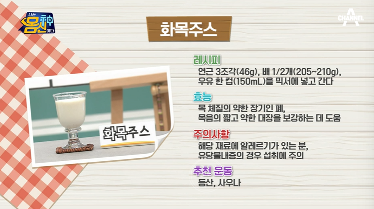 - 추천 주스 : 화목 주스 (연근 3조각, 배 1/2개, 우유 한 컵 150mL을 믹서에 갈기, 취향껏 꿀 추가)