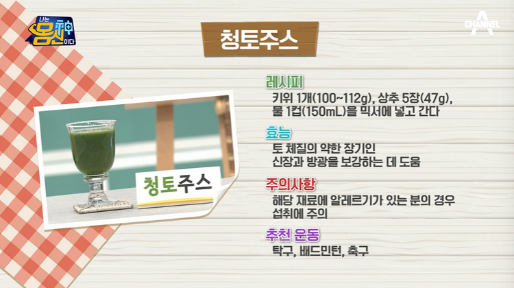 - 추천 주스 : 청토 주스 (키위 1개, 상추 5장, 물 1컵 150mL 넣고 믹서에 갈기)