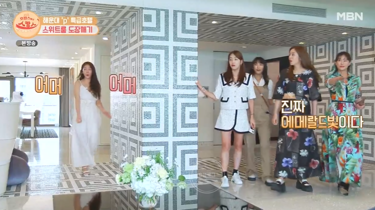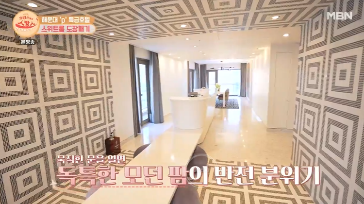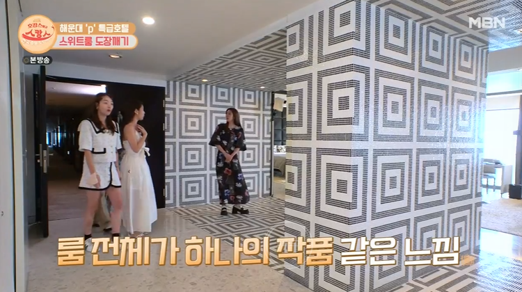 이제 15층 스위트룸을 살펴볼게요. 문을 열었는데 그냥 호텔 로비인 줄.. 화려한 패턴이 느낌있네요. 진짜 룸 전체가 하나의 작품 같은 느낌. 팝 아트 같은 인테리어는 뉴욕 맨해튼, 스튜디오 가이아 등 유명 인테리어 디자이너가 직접 디자인했대요. 타일 하나하나 흑과 백의 조화를 살렸다고. 최근 손흥민이 다녀갔대요! 싸이도 투숙함!