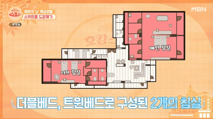 침실은 메인과 서브 2개가 있어요. 더블베드, 트윈베드로 구성! 이 외에 사우나, 다이닝 공간까지 갖췄네요.