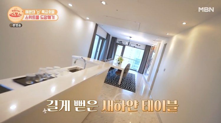 주방에서는 요리도 할 수 있는데, 길게 뻗은 새하얀 테이블이 인상적이에요.