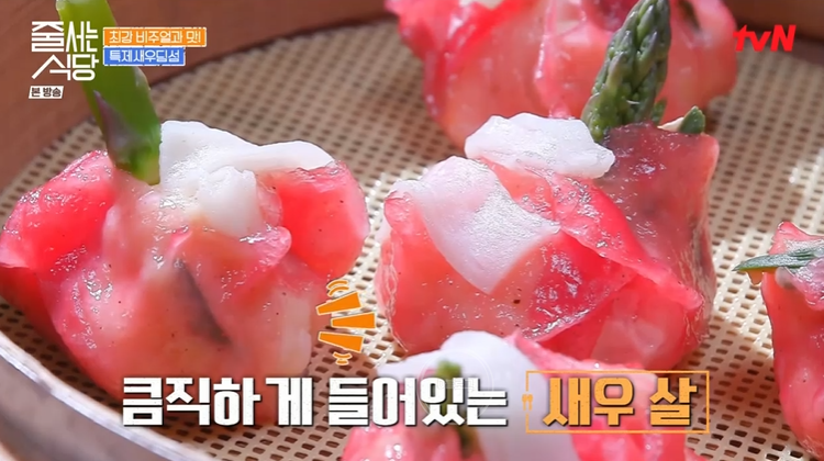 마지막 메뉴는 특제새우딤섬! 화과자 같은 비주얼이에요. 백년초 가루를 사용해 피가 빨갛대요. 아삭한 식감을 위해 아스파라거스 추가! 게맛살도 올려 올려! 다진 새우가 아닌 큼직한 새우 살이 들어갔어요. 피가 떡처럼 쫄깃쫄깃하다고.