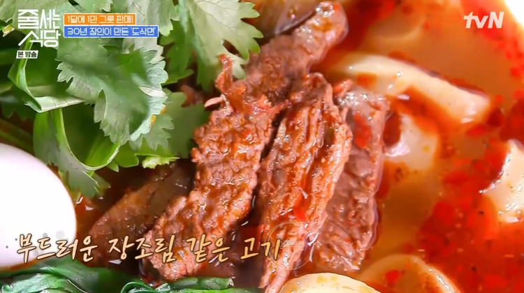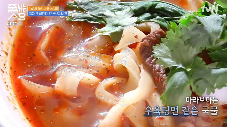 미리 끓여둔 사골 육수에 매콤한 특제 양념장을 넣고 한우 진액과 함께 푹 끓여줘요. 그리고 면 위에 붓고 각종 토핑 올리기! 박나래는 부드러운 고기와 우육탕면 같은 국물 맛에 폭 빠졌네요. 매운맛과 향신료가 세지 않고 기분 좋은 알싸함이 느껴진대요. 얼얼함 뒤에 마라 향이 쓱 찾아온다고.