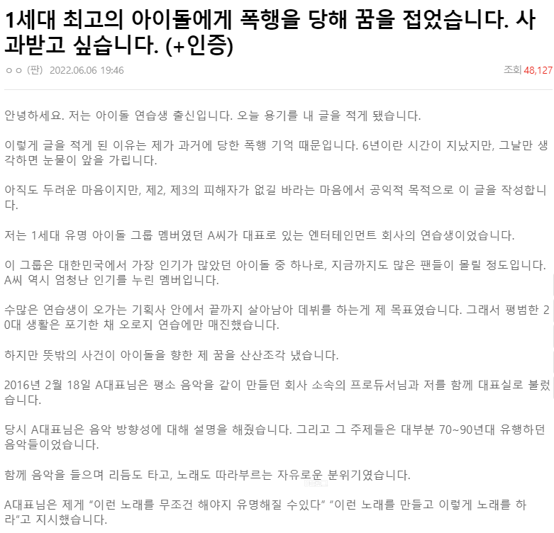 먼저 글쓴이는 6년 전 폭행을 당했으며, 제2의 피해자가 없길 바라는 마음에서 공익적 목적으로 글을 작성한다고 이유를 밝혔어요. 1세대 유명 아이돌 그룹 멤버였던 A 씨가 대표로 있는 엔터테인먼트 회사 연습생이었다는 글쓴이. 해당 그룹은 국내에서 가장 인기가 많았던 아이돌 중 하나로, 지금도 많은 팬들이 몰릴 정도래요.
